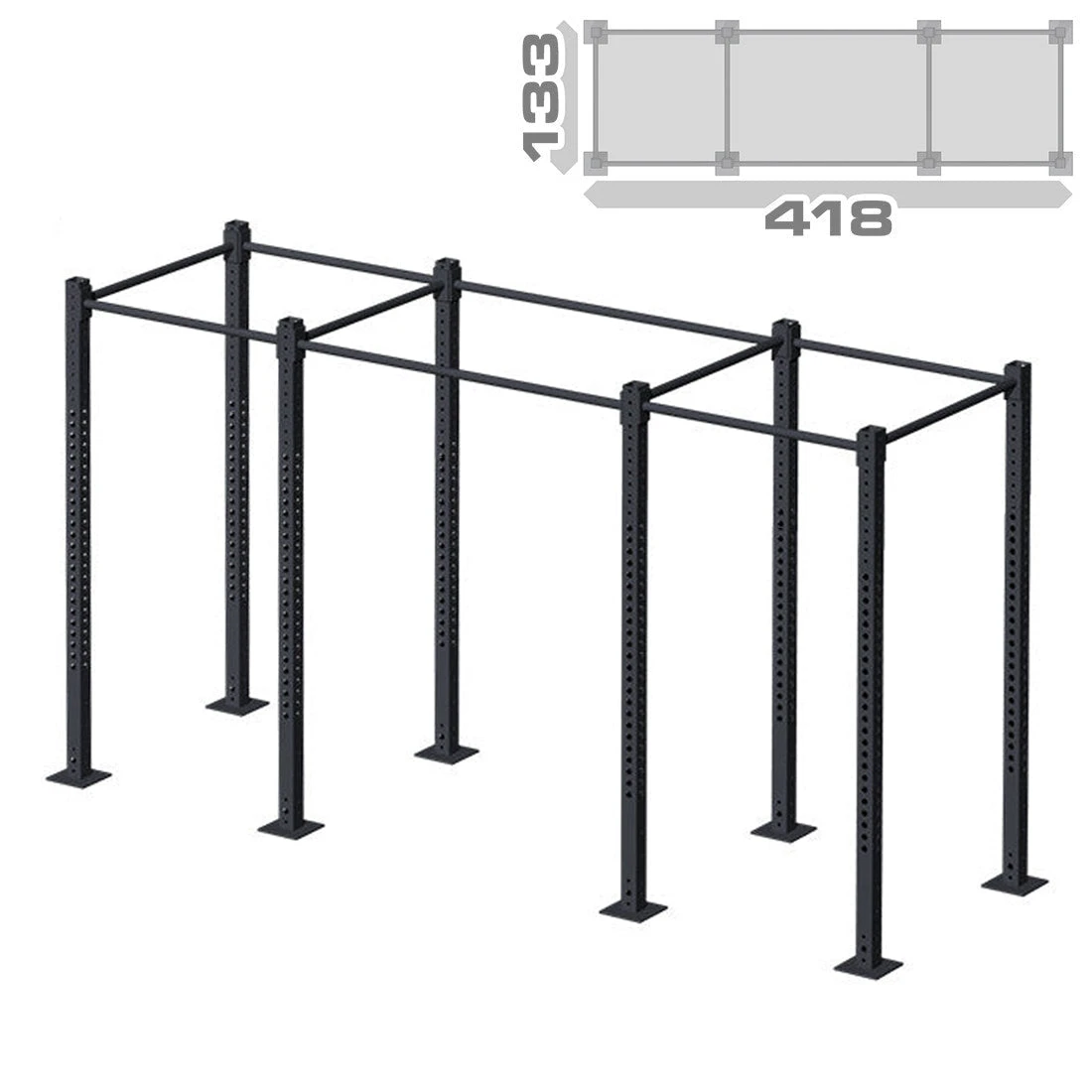 Vielseitige Trainingsstation mit 3mm dicken Grundpfeilern aus Stahl, mit Klimmzug- und Kniebeugestation sowie Möglichkeiten für vielseitige Erweiterungen.